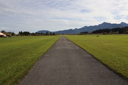 Vogtareuth Füssen verläuft problemlos, Wunderbarer Flugplatz direkt am Fuße der bayrischen Königsschlösser. Im Endanflug 08 rekapituliere ich nochmals die Anfluginfo am Blattl: "1000*60 mtr. Gras, davon 450mtr. nutzbar, TO/LDG auf der Südseite der Bahn, auf oder nahe am Asphaltstreifen".