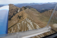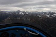 Ab nach Füssen, Falkenfüttern mit Mogas, blaue Falkenschuhe anziehen und ab gehts, Kurs West, prächtig. Ja, in Hohenems seh ich das herannahende Wetter schon deutlich stehen und das passt genau, ich dreh vorm Wetter um und fliege ihm davon. Wahnsinnsgegend hier, ein wirklich toller Teil unseres Landes, ich mein, Triebwerksausfall wünsch ich mir da keinen, die Landemöglichkeiten beschränken sich unter das berühmte Minimum, es gibt da zeitweise garnix was auch nur im entferntesten land-bar aussieht. Deutlicher Wind aus Südwest, also fliege ich an den Südhängen entlang, ich bin fast 10.000 ft und nicht wirklich über den Bergrücken, ein Saufen in den engen Tälern kann ich da garnet brauchen.