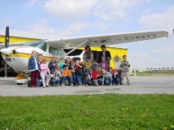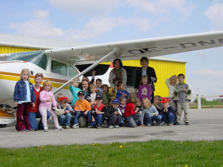 | Die Kindergartengruppe des Safarik-Kindergartens Stockerau, unter der Leitung von Ingrid Weber, besuchte am 25.4.2002 den Flugplatz. 24 Kinder und einige interessierte Erwachsene hatten viele Fragen – und bekamen von den Mitgliedern die richtigen Antworten. Selbst die erwachsenen BegleiterInnen waren von den Ausführungen so begeistert, dass dieser Vormittag viel zu schnell verging. Zum krönenden Abschluss durften sich die Erwachsenen Begleiter den Flugplatz "von oben" betrachten. Die Gruppe bedankte sich bei Hannes Bartosch mit einem selbstgemalten Fliegerbild, welches einen Ehrenplatz in der Kantine finden wird. Feedback: Selbst am nächsten Tag schwärmten die Kinder noch von den vielen Eindrücken, die sie am Flugplatz sammeln konnten. Danke an alle Mitwirkenden! |