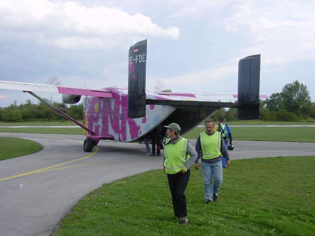Einige Skyvanbilder.... Leider hat es auch einen gebrochenen Fuß gegeben. Wir vom Flugplatz, wünschen baldige Besserung an den Passagier! Unsere Verpflegscrew bei der Arbeit. Da das Wetter schlecht und der Andrang eher "malo", blieb auch Zeit, um ein Würsterl selber zu essen. Helmut mit der Yak war auch da. Ein Vorgeschmack auf morgen liegt in den nächsten Bildern. Einige unserer Gründungsmitglieder sind am Flugplatz. Einer der "Hähnels" ist extra aus Spanien angereist. Mehr davon in der morgigen Ausgabe von Pink Boggie 4 in Stockerau... oder ist es doch ein Blue Boggie ???