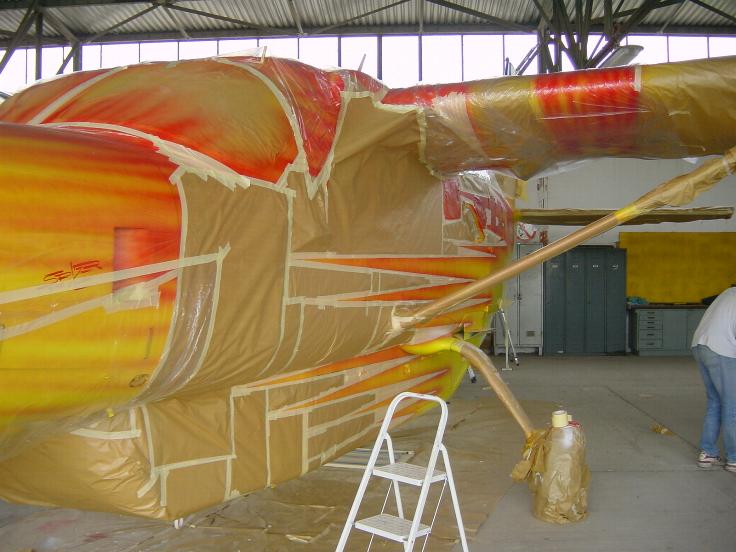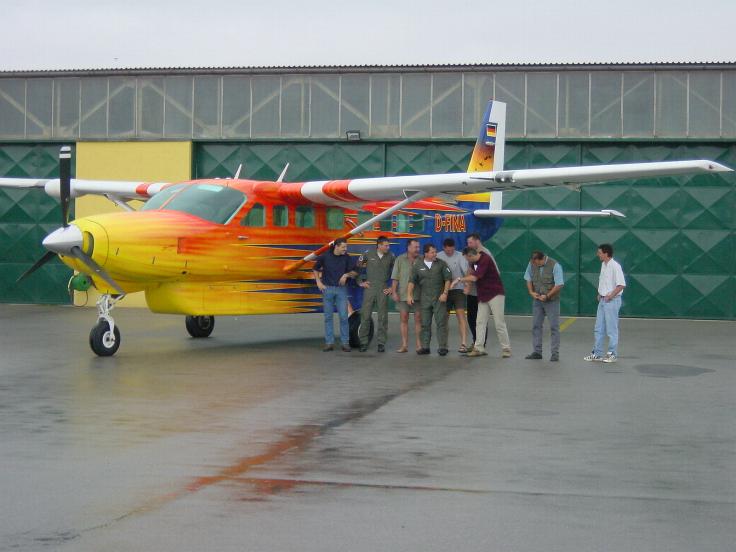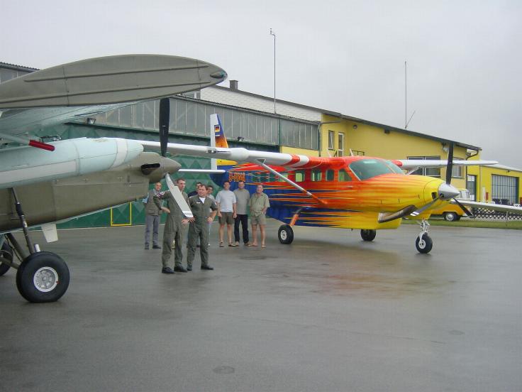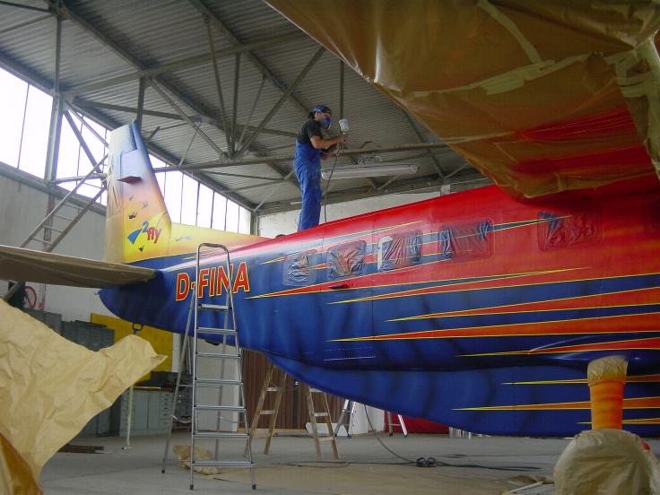In Stockerau war's soweit, Werner Spitzer hat eine Cessna Caravan verbuntet. Das erste Abenteuer war das Hangarieren der Caravan, da das Leitwerk höher ist als unsere Tore. Das zweite Abenteuer, das Einräumen unserer eigenen Flieger im Hangar, welcher normalerweise nicht gerade gähnend leer ist. Nach dem Aufschleifen des Vogels, Grundierung und gelbe Untergrundfarbe. Die weiteren Stufen sind mit Bildern dokumentiert... Zum Rollout hat sich auch das Bundesheer eingefunden, ein kleines PT-6 Treffen (../newssystem/imagesNews/old_archive/images/pt6asmall.asp)