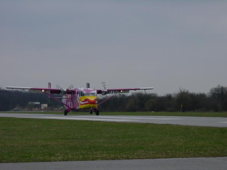 Pünktlich um 09:00 Uhr, das Wetter reisst auf, hebt Robert die "Pink" vom Boden, und fortan immer und immer wieder. Der rege Verkehr von etlichen Einmots stört ihn kaum, ich wette, es taugt ihm sogar. Gekonnt manövriert er die Skyvan millimetergenau zwischen dem Bell Jetranger von Capt. Eisinger und der YAK unseres Kunstfliegers Helmut Hausader durch. die SkyVan ist ja immerhin keine kleine EinMot, sie hat über 5 Tonnen Gewicht und kann 30 Personen raufbringen. So mancher Exekutive-Jet schaut dagegen blass aus...
