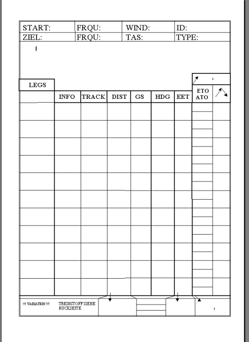 Ein neues Formular zur Flugvorbereitung erwartet Euch im Register "Download". Mit diesem Formular hat der Anfänger die Freiheit, das aufzuschreiben, was er will und ist nicht gezwungen, zB. das Squawk-Fensterl zu suchen, wenn er gerade eine Freigabe erhält. Das Formular besteht aus einer Vorder- und einer Rückseite und ist im Format Word 97 zum Download verfügbar.