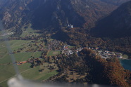 Vogtareuth Füssen verläuft problemlos, Wunderbarer Flugplatz direkt am Fuße der bayrischen Königsschlösser. Im Endanflug 08 rekapituliere ich nochmals die Anfluginfo am Blattl: "1000*60 mtr. Gras, davon 450mtr. nutzbar, TO/LDG auf der Südseite der Bahn, auf oder nahe am Asphaltstreifen".