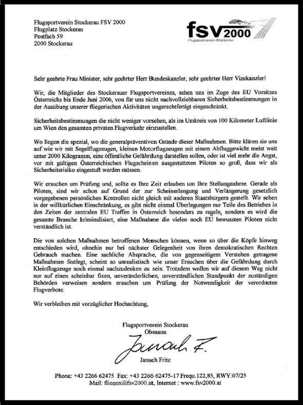 | Liebe Mitglieder! Zwar nicht ausschließlich auf Grund meines Schreibens sondern auch durch die Bemühungen mehrerer anderer Vereine ist es am 13. 03. in Tulln zu einer Besprechung über die geplanten Einschränkungen gekommen. Da wir nicht zusätzlich Öl ins Feuer schütten wollen ist es selbstverständlich, dass wir uns an das in diesem Gespräch ausgesprochenen Verschwiegenheitsgebot soweit es die generelle Planung betrifft halten werden. Klar ist, dass wir nicht vor hatten zu polemisieren sondern Lösungen für Flugmöglichkeiten während der Tage der großen EU Treffen festzulegen. Das ist soweit, siehe Bericht von Wolfgang, erfolgt. Da ich nicht Mitglied einer durch wirtschaftliche Interessen mit anderen Möglichkeiten ausgestatteten Lobby sondern Mitglied in einem gemeinnützigen Flugsportverein bin sind meine offiziellen Möglichkeiten gegen ungerechte und nicht sinnvolle Maßnahmen anzutreten begrenzt. Ich ersuche jeden von uns der Möglichkeiten und Interesse daran hat unsere Anliegen zu platzieren das auch bei Entscheidungsträgern zu gegebenen Anlässen zu tun. Bitte vergesst nicht wir leben zwar nicht davon, aber die Fliegerei ist wohl bei den meisten von uns ein Fixpunkt unserer Interessen. Bedanken möchte ich mich für die direkte Stellungnahme durch den Bundeskanzler und für die Anmerkung der Pressestelle der Frau Innenminister unseren Brief erhalten zu haben, nicht reagiert hat Vizekanzler Minister Gorbach. Fritz |