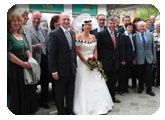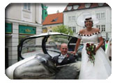 | Bei doch nicht ganz so schlechtem Wetter wie vorhergesagt hat unser Segelkunstflug-Staatsmeister Christian Vohryzka seine Karin am 28.5. im Korneuburger Festsaal geheiratet. Als Überraschung von uns Segelflieger war gedacht, das Hochzeitspaar in einem Segelfliegerrumpf vom Standesamt zur Hochzeitstafel in Enzersfeld zu transportieren. Wie es sich für einen Kunstflieger gehört sollte das natürlich mit unserer Fox OE-5666 erfolgen. Gekommen ist jedoch alles anders als geplant, da unsere Flieger für Gästeflüge in Niederöblarn gebucht war, aber nach einigen Telefonaten sind unsere Tullner Segelfliegerfreunde mit ihrer Fox eingesprungen. Den Airbrush-Geier haben wir dann doch nicht vom Rumpf geschliffen, wie wir es den Tullnern angedroht haben. Unser Vorhaben, das frisch vermählte Ehepaar im Cockpit zur Hochzeitstafel zu fahren, hat sich aber wegen der unpassenden Kleidung von Karin leider als nicht durchführbar herausgestellt. Christian hat natürlich beim Anblick der OE-5610 sofort die Braut und die gesamte Hochzeitsgesellschaft vergessen und ist wie der geölte Blitz ins Cockpit gesprungen, so dass es für die von Hannes Bartosch verständigte Presse zumindest für einige Fotos mit der Braut vor dem Flieger gekommen ist. Nach den Fotos musste Christian zum ersten Mal die harte Realität des Ehelebens erfahren, da ihn Karin nur mit einigem Nachdruck aus dem Cockpit bekommen hat. Falls jemanden die seriösen Typen mit Anzug und Krawatte auf den Fotos bekannt vorkommen: Ja, es sind tatsächlich unsere Segelflieger. An dieser Stelle noch mal alle Glückwünsche an das Ehepaar und Dank an die Tullner Segelflieger, dass sie uns ihre Fox für diese Überraschung zur Verfügung gestellt haben. Anm. d. Redaktion: Wir gratulieren dem Paar auf das allerherzlichste! |