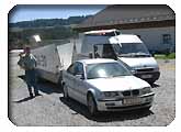 Die Transport-Crew: Bei einer nicht ganz gelungenen Landung in Freistadt ist unser Falke OE-9125 über einen Begrenzungspflock gerollt und im Bereich des linken Querruder ziemlich beschädigt worden. Günther Aichinger hat sich bereit erklärt, auch diesen Schaden, wieder zu reparieren, aber dazu muss der Falke erst mal nach Stockerau transportiert werden. In der Vorbereitungsphase haben wir ausführlich darüber diskutiert, ob und wie der beschädigte Falke transportiert werden kann. Unser Twin-Hänger soll angeblich für einen Falkentransport umgebaut worden sein, aber keiner weis mehr, ob auch die Flächen reinpassen und tatsächlich drinnen war auch noch nie ein Falke. Aus Sicherheitsgründen beschließen wir dann, doch mit 2 Hängern loszufahren, da wir mindestens 5-6 Personen zum Zerlegen brauchen und daher mit 2 Autos fahren müssen. Da ist es dann schon egal, ob wir einen Anhänger hinten dran hängen haben oder nicht. Wir packen noch jede Menge Polster, Matratzen, Schaumstoff, Styropor, Zurrgurte, Seile, Zwingen, Holzstaffeln und Werkzeug in die Hänger. Rudi hat als Installateur sowieso die halbe Werkstatt im Bus (Bohrmaschinen, Flex, Schweißgerät usw.) und Günther Aichinger nimmt für alle Fälle noch eine Säge mit. Das Werkzeug zum Rausziehen des Hauptbolzen vergessen wir auch nicht (wäre schon peinlich, wenn 7 Personen mit 2 Hängern ankommen und dann das wichtigste Werkzeug nicht mithaben). Abfahrt am Samstag um 6:00 (!) in Stockerau, Ankunft in Freistadt um ca. 9:00. Wir beginnen danach gleich mit dem Zerlegen des Falken, das bei der hohen Temperatur zwar ziemlich schweißtreibend ist, aber doch recht zügig voran geht. Nach 3 Stunden und viel improvisieren (Seitenruder abbauen, Höhenruder am Autodach) sind alle Teile des Falken sicher verstaut und nach weiteren 3 Stunden im Auto treffen wir um ca. 16:00 wieder in Stockerau ein. |