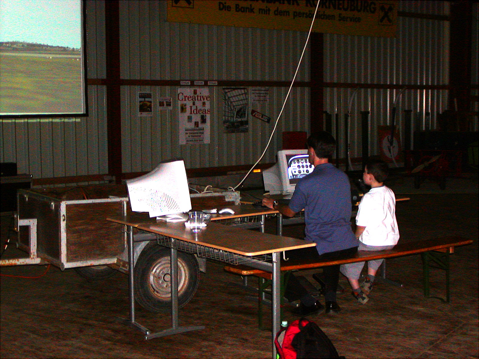 | Auf dem Vorfeld stehend konnten die Besucher des Flugplatzfestes die Fähigkeiten der Kunstflieger bewundern, die Flotte des FSV 2000 wurde sowohl im Static Display als auch im Flug vorgeführt. Welcher Besucher möchte da nicht einmal mit den Piloten Platz tauschen und einmal selbst am Steuerhorn ziehen? Eine schnelle Platzrunde in Stockerau oder doch lieber ein Trip nach Wr. Neustadt? Alles möglich – mit dem Flugsimulator. Im Rundhangar stand er dann: Unser Simulator. Die Sicht nach außen über einen Beamer mit etwa 5m breiter Projektionsfläche, das Instrumentenbrett auf einem Monitor direkt vor dem Piloten, ein Navigationsprogramm auf einem Zusatzbildschirm sowie ein Laptop für die Wind- und Wettereinstellungen – das ganze wurde noch über ein Netzwerk verbunden und fertig war der Traum vom Fliegen für Nicht-Piloten. Peter Felix, Alexander Res und Philipp Weingartshofer betreuten den Simulator während des Betriebes. "Lustig war das Verhalten unserer Besucher. Meistens schoben die Väter ihre Kinder vor, denn ‚Computerspielen’ das muss doch was für Kinder sein, oder? Dass spätestens nach einer Minute Nachwuchs und Vater sich ums Steuerhorn stritten, das steht wohl auf einem anderen Blatt..." berichtet Philipp Weingartshofer, selbst zwar kein "echter" Pilot, aber seit Jahren Simulatorflieger bei einer virtuellen Fluggesellschaft, der Austrian Virtual Airlines. Alexander Res, ebenfalls AVA-Pilot: "Als Abwechslung zu den unzähligen Platzrunden in LOAU kamen dann noch einige Vorführungen mit Real-Life-Piloten, so zB eine kurze Präsentation der Boeing 737 mit echter Flugsicherung! Den Part der Air Traffic Controller übernahm Jose Theuer, Movementcontroller am Flughafen Wien. "Wir haben unseren Besuchern volles Programm geboten und hoffen natürlich auch, dass sie auf den Geschmack gekommen sind – sei es jetzt ‚ real-life im FSV Stockerau oder virtuell mit dem Microsoft Flugsimulator und Austrian Virtual Airlines." fasst Philipp Weingartshofer das letzte Wochenende zusammen. Philipp Weingartshofer Anm. d. Red: |