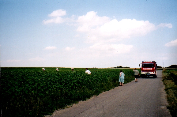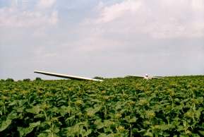 | Samstag 22. 06. LOAU. Christian hat sich, ohne daß ich es bemerkt hätte am PC hinter mich gestellt und meinen Ausführungen zum Wetter gelauscht. Da ich bereits seit längerem keinen Streckenflug mehr gemacht habe, ist bei meiner Auslegung eine gehörige Portion Optimismus dabei, aber das kann ja nicht schaden. Wir entscheiden uns mit dem Twin Astir eine Strecke zu probieren. Der Rudi wie immer leicht anzustecken ist bereits fast in der Luft, wenn nicht immer die lästigen Eingaben in seine Streckenflugrechner wären. Rudi hat sich gleich 500 km vorgenommen, die aber letztendlich auch zu viel für den Tag werden. Wir starten um 12:36 im Logger ist eine "freie Strecke" eingegeben. Bei mühsamen Basishöhen von 1200NN - 1400NN im Raum LOAU ist die Entscheidung überhaupt auf Strecke zu gehen schon schwierig. Bis Langenlois, wo wir uns dann auf 800NN wiederfinden, steigt bei Christian eher der Verdacht mit einem Draufgänger unterwegs zu sein, der entweder die falsche Brille auf hat, oder bei dem der Höhenmesser falsch eingestellt ist. Aus meiner Sicht geht es zwar schlecht, aber es geht. Die Aufwinde sind von unten schlecht zu zentrieren und gewinnen erst knapp unter der Basis an Zugkraft. Via Gars am Kamp, Horn, Mödring sind wir dann am Horner Wald, der offenbar kurz vor unserer Ankunft abgeregnet hat und gerade wieder aufbaut. Hier ist gut zu beobachten wie schnell bei einem entsprechenden Gradienten und entsprechenden Temperaturen die Entwicklung wieder beginnt. Die Steigwerte bleiben aber nach wie vor unter den Erwartungen. Schöne Wolken aber eben nur zum anschaun. Hier treffen wir die Entscheidung zurück nach LOAU zu fliegen. Der Versuch beginnt noch ganz brauchbar. Am Horner Wald 1600NN zurück ins Kamptal, hier bereits eher wenig bis nix. Querung von Gars Richtung Mannhartsberg noch immer nix. Weiterflug Richtung Langenlois schon gar nix. Dann geht’s rasch. Der letzte aussichtsreiche Bummel zieht wie die vorangegangenen auch nicht. Die Entscheidung zur Landung ist gefallen. Den vorerst ins Auge gefassten Acker verwerfe ich im Queranflug, der ist mir zu knapp bei der Straße. Dahinter ein wunderschönes grünes Feld. Als nicht Agrarier ist mir noch nicht klar was in den nächsten Sekunden über uns zusammenschlagen wird. Der Sporn raschelt bereits in den Pflanzen, wir fliegen aber noch immer. Grün beruhigt. Voll durchgezogen setzten wir mitten in den Sonnenblumen auf. Vor uns GRÜN, neben uns GRÜN, über uns GRÜN. Das Gesicht vom Christian kann ich nicht sehen aber wahrscheinlich auch GRÜN. Der hupft gleich aus dem Flieger und beginnt Fotos von unserem Flurschaden zu machen. Der Flieger steht 20 Meter von der Straße in einem mit 140cm hohen Sonnenblumen bewachsenen Feld. Wenigstens davon rollen kann er uns nicht. Der erste Schaulustige, die ersten Fragen. Is ihnan die Luft ausgangen? Warum haben’s den den Motor nicht eingeschalten. Aber wo Schatten ist da ist auch Licht. Der Frager ist Mitglied der freiwilligen Feuerwehr Hohenwart. Er fragt ob er helfen kann. No Na. Was kost’s. Nachdem er darauf nicht schnell genug antwortet biete ich eine Kiste Bier für die Mannschaft wenn sie uns bei der Zerlegung und Schleppung des Twins aus dem Acker hilft. Gitti mit dem Rest ist auch bereits im Anrollen. Die Verladung im Hänger und der Rücktransport verlaufen durch die "Nötschgeprüfte" Mannschaft perfekt. Außenlandungen mit dem Twin sind ja nur dann möglich, wenn die Infrastruktur so passt wie bei uns. Der Günther und der Herbert verkürzen unsere Heimreise durch sicher gutgemeinte aber ebenso unnötige Ratschläge. Danke, aber nächstes Mal holen wir Euch. Christian + Fritz |