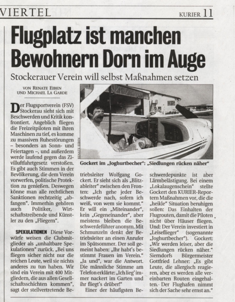 Auf einen Anruf eines Anrainers hin, wurde letzte Woche der Kurier aktiv. Angeblich fliegen unsere Flugzeuge illegal über die Ortschaften und zudem in zu geringer Höhe. Die Lärmbelästigung wird unzumutbar, so der Anrufer. Nachdem wir die Reporter von unseren Maßnahmen zur Lärmreduktion in Kenntnis gesetzt haben und ein Lokalaugenschein mittels Flugzeug "von der nicht im kleinsten Maße grenzenlosen Freiheit der Lüfte" überzeugt hat, entstand der Artikel.