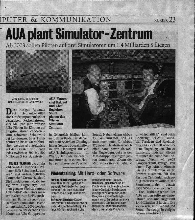 | Vor einigen Tagen schon gab es einen bemerkenswerten Beitrag im KURIER - unsere AUA soll ab 2003 drei Simulatoren anschaffen - Kaufpreis 1,4 Milliarden Schilling. Geplant sind ein A330/340 und ein A320, der dritte Simulator ist noch offen. |