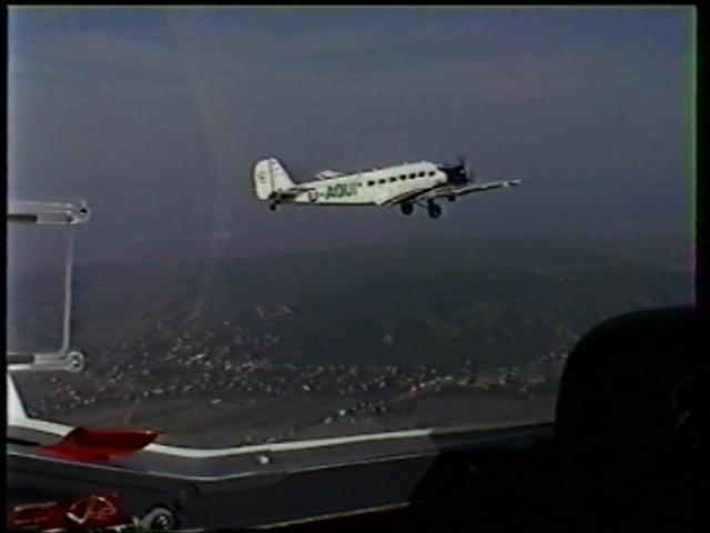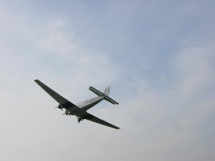 | einen Verbandsflug mit der Tante Ju der Lufthansa. Christian Lenz von FIC hat am Vormittag die Gelegenheit genützt, mit der Ju 52 mitzufliegen. Bei dieser Gelegenheit vereinbarte er mit den Piloten, einen Katana - Ju Verband über der Burg Kreuzenstein. Gesagt, getan - über Korneuburg haben wir auf die alte Dame gewartet, Wien TWR gab uns eine Einflugfreigabe Richtung Schwechat und über dem Donauturm sind wir Ihr dann begegnet. Enger 180er und der Ju folgen. In Respektabstand sind wir der D-AQUI gefolgt. Ein Kreis über der Burg in lockerer Formation zum Filmen. Als die D-AQUI dann Richtung Greifenstein und weiter retour nach Wien flog, haben wir aufgeschlossen. Über der Au bei Korneuburg sind wir in engem Verband mit der Junkers geflogen -- wirklich beeindruckend, diese Momente. Abgesehen vom fliegerischen Erlebnis, ist es auch ein Treffen der Technologien, Wellblech und Kunststoff, 3*660 Ps gegen 1*100 Ps bei gleicher Speed. Als Christian dann die Kamera abgesetzt und den an den Fenstern sitzenden Passagieren gewunken hat, war es lustig anzusehen, wie hinter allen Fenstern Bewegung aufkam -- winke winke bei allen Guckerln --. Ein Funkspruch des Ju Captaines rief mich dann wieder in die Gegenwart zurück, wir flogen ihm zu knapp in Formation. Hoffentlich gelingt es uns, aus dem Video ein paar Bilder zu digitalisieren und in den nächsten Tagen Online zu stellen. Gestern am Samstag, hat uns Herr Tillmann sen. dann eine weitere Ju Attraktion verschafft -- einen Ju 52 Überflug in Stockerau am Flugplatz. Um ca. 16:20 kam Sie angebrummelt, Überflug in ca. 30 Metern Höhe über unseren Flugplatz. Richtig beeindruckend..... Leider habe ich nur ein Bild im Vorbeiflug schießen können, ein zweites von den Zuschauern.