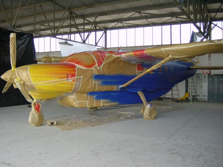 In Stockerau war's soweit, Werner Spitzer hat eine Cessna Caravan verbuntet. Das erste Abenteuer war das Hangarieren der Caravan, da das Leitwerk höher ist als unsere Tore. Das zweite Abenteuer, das Einräumen unserer eigenen Flieger im Hangar, welcher normalerweise nicht gerade gähnend leer ist. Nach dem Aufschleifen des Vogels, Grundierung und gelbe Untergrundfarbe. Die weiteren Stufen sind mit Bildern dokumentiert... Zum Rollout hat sich auch das Bundesheer eingefunden, ein kleines PT-6 Treffen (../newssystem/imagesNews/old_archive/images/pt6asmall.asp)