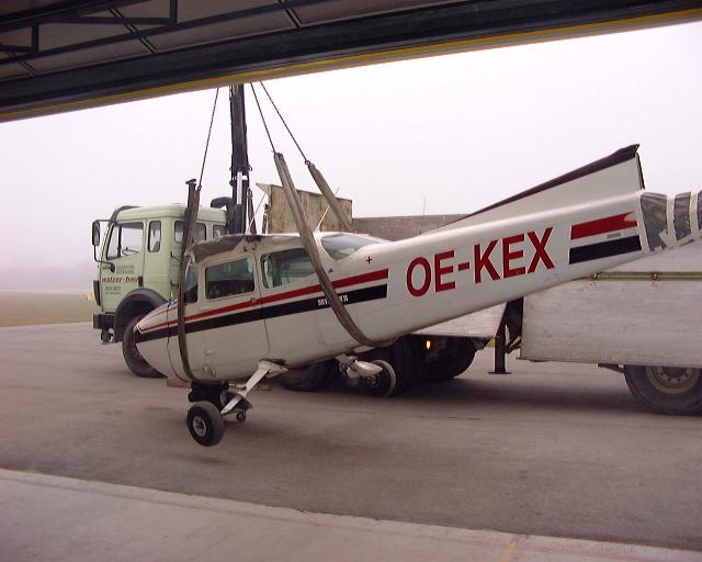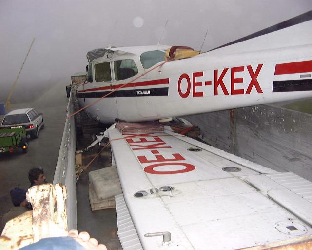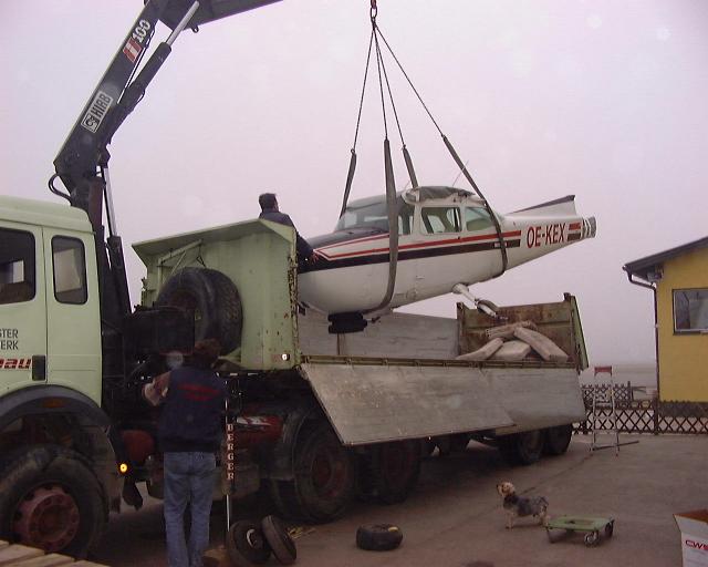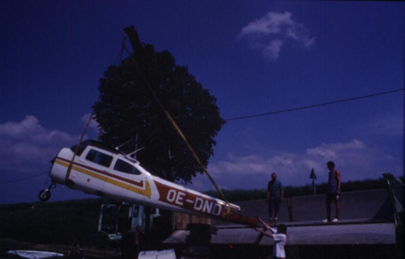 | Das mit der Ehre und dem Michael ist super, habe mir beim Betrachten der Bilder vom KEX Transport auch so was gedacht, daß wir eigentlich tolle Mitglieder haben, welche dem Verein unentgeltlich helfen. Der Fritz Walzer sorgt heuer schon zum zweiten mal für einen Transport (www.retzer-land.co.at/Walzer/). Diesmal in die Werft Linz. Beim Verladen der Hauptteile des Flugzeuges habe ich einige Bilder gemacht. Dabei meinte der Fahrer des LKW, daß dies schon seine dritte Fahrt ist. Neben den beiden heurigen KEX Aktionen war er auch in Italien für uns, als er die DND abgeholt hat, damals, als dem Fritz Uhl das Triebwerk stehen geblieben ist. Am 17.06.1996 ist unser Fritz, bei Savio (Italien) notgelandet. Nach dem Start in Pescara wollte er nach Portoroze fliegen. Querab von Ravenna (ca. 15 Kilometer am Meer draußen) streikte der Motor. Ein Kolben war gebrochen und das Pleul hat Teile des Kolbens durch das Kurbelgehäuse nach außen befördert. Nach einer perfekten Notlandung -siehe Bild-, haben sich einige unserer Mitglieder auf den Weg gemacht die 182er nach Hause zu holen............ Übrigens, die KEX ist gut in Linz angekommen. |