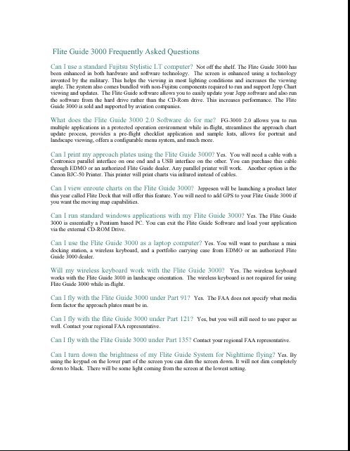 | Für alle, die es schon immer gehasst haben, die Jeppesen Ergänzungslieferungen der diversen Updates einzusortieren (oder es sogar vergessen haben), gibt es seit kurzer Zeit 2 neue Produkte. Dies sind das Northstar 1000 und Flite Guide 3000. Ich habe beide getestet und mich für das Flite Guide 3000 entschieden. Dabei handelt es sich um ein kleines, aber feines Notebook mit allen Anschlüssen und Touchscreen (beschrieben auf www.edmo.com und lt. Beilage). | |||