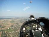 Irgendwo in der Nähe von Großmugl kreise ich ungefähr 1000m über Grund gemeinsam mit zwei Falken (die richtige natürlich, nicht die vom Flugplatz). Es ist schon bewundernswert, mit welcher Leichtigkeit diese Vögel das Zentrum des Aufwindes finden und plötzlich stürzt einer mit eng an den Körper gelegten Flügeln und hoher Geschwindigkeit unmittelbar neben mir nach unten. Unglaublich, dass er aus dieser Höhe noch seine Beute irgendwo unter uns erkennen kann. Ich sehe nur einen Traktor, aber den wird er vermutlich nicht im Visier haben.